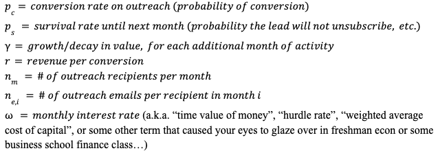 Some of you may recall the simplification of an infinite, decaying series. Others of you will not recall this simplification, but recall that at one point, you did recall said simplification and take some solace therein. And others will cringe at even the parsing of the clause containing words like simplification, infinite, and decaying. Mercifully, if we assume a consistent number of emails per month per lead (and for what’s left of my sanity, can we please?), call it n, and apply the simplification here: