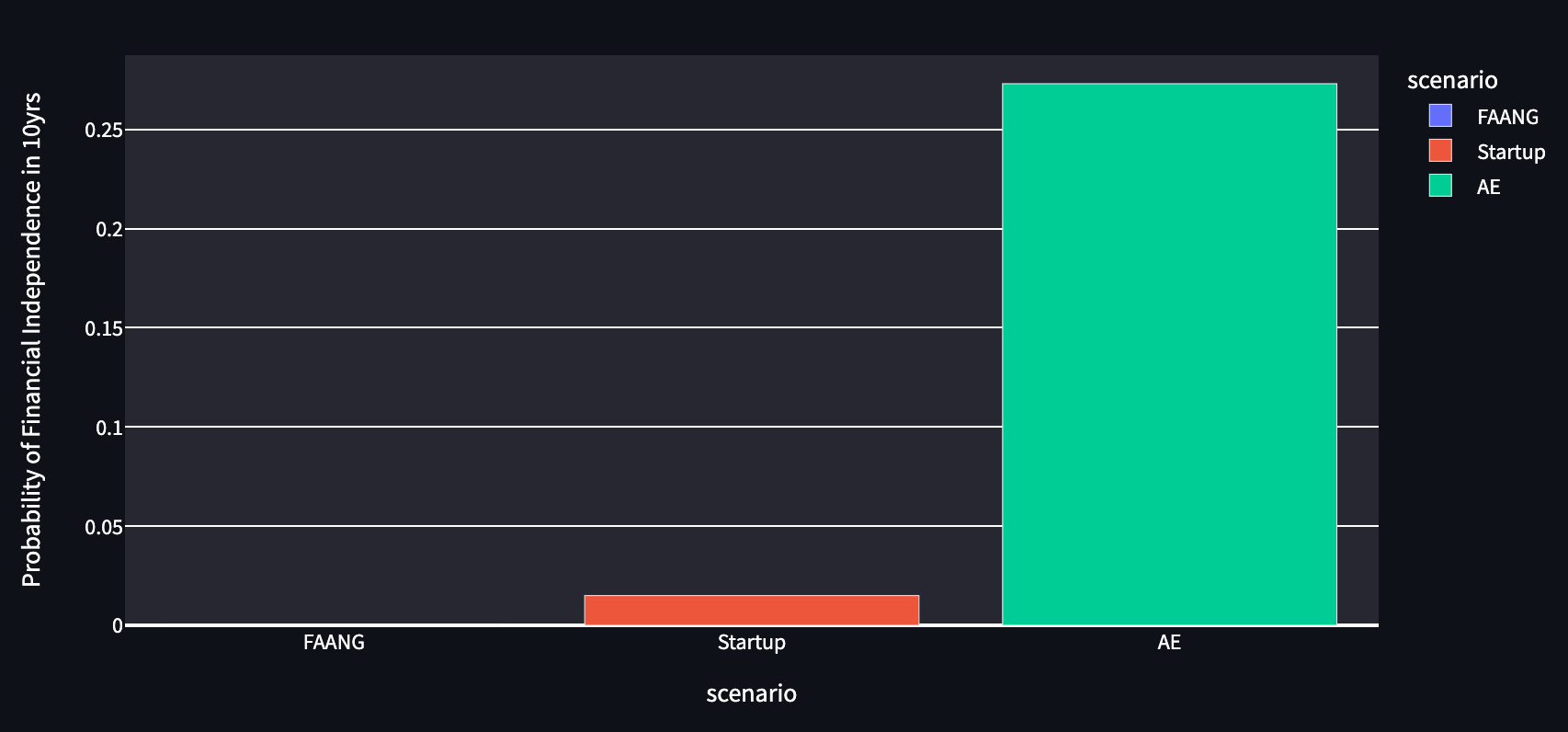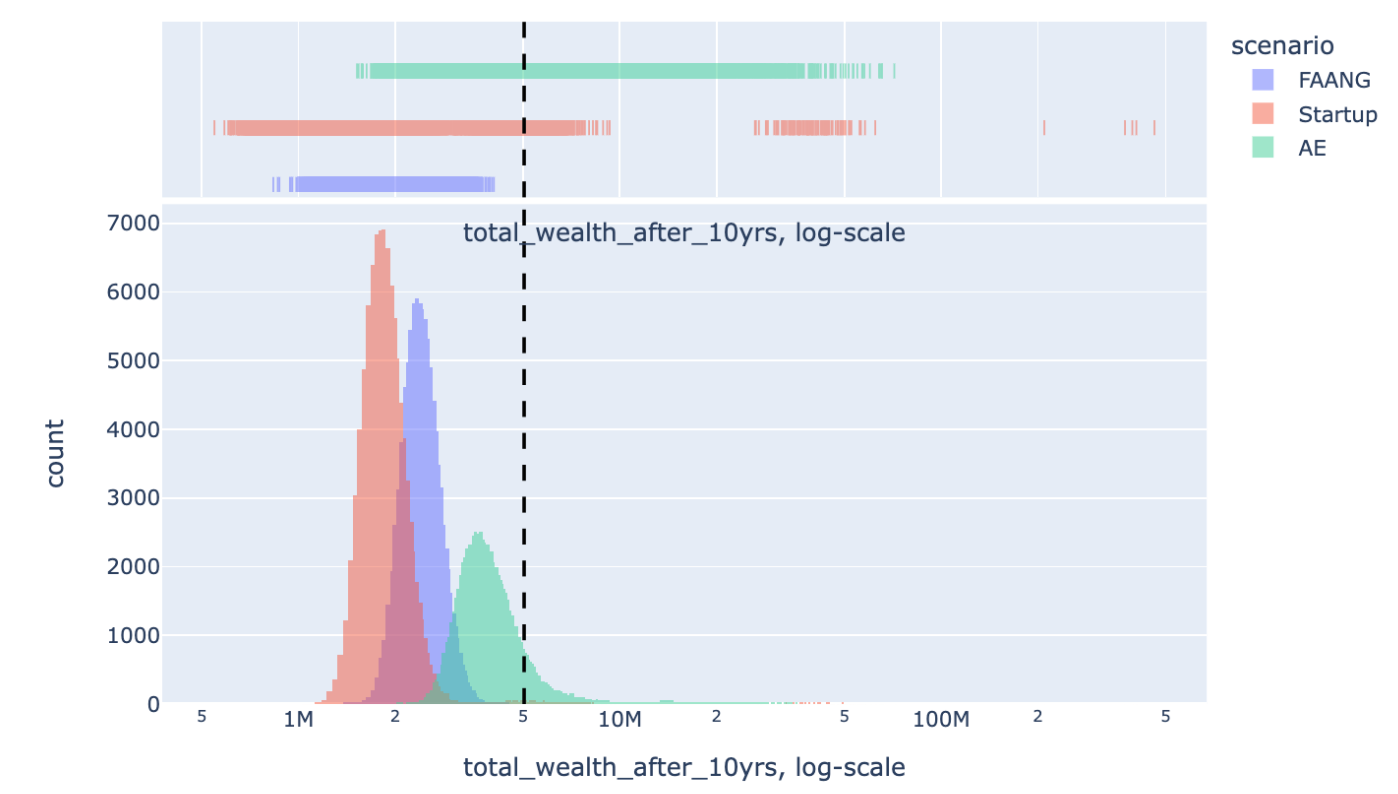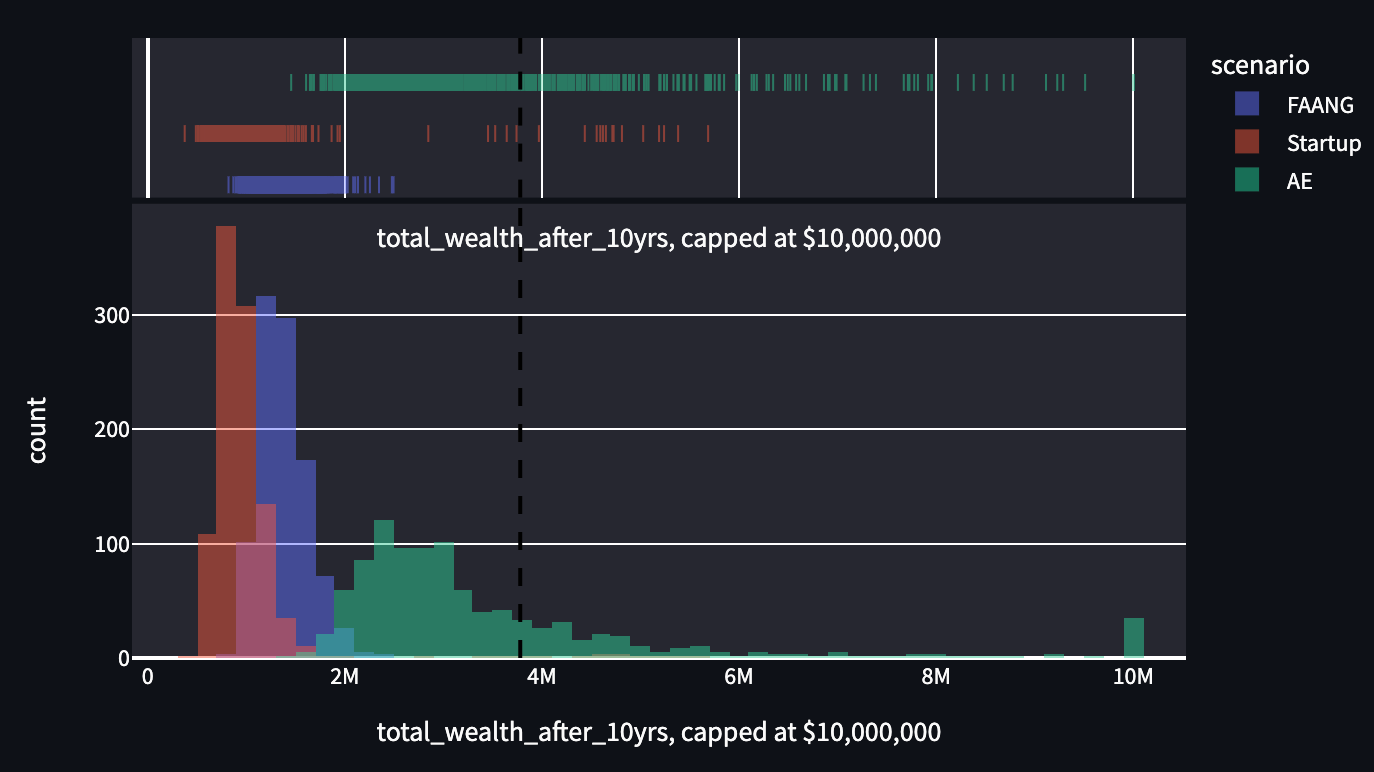 One illustrative exercise is to generate some assumptions about the distribution of outcomes at startups, FAANGs, and AE, then run the clock forward hundreds of thousands of times.