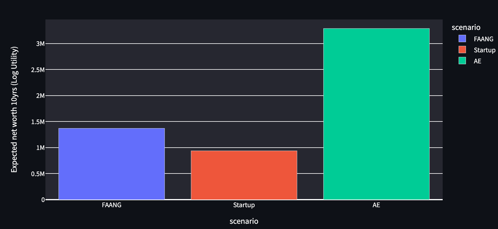The expected log-utility of net-worth11 (Figure 3) is clearly leaning in AE’s direction, with FAANG outpacing startups by a smaller margin.