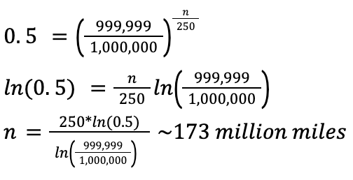 The probability of driving a vehicle n miles, and surviving, is given (approximately3) as: