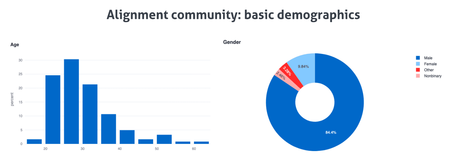 Of note, the majority of alignment researchers are under 30. Males outnumber females approximately 9 to 1 in alignment. While this gender distribution is not unfamiliar in engineering spaces, it certainly seems worth explicitly highlighting, especially to the degree that male and female alignment researchers do seem to exhibit meaningfully different views about the core aims of alignment research (including, critically, the very question of whether alignment research explicitly requires an engineering-style background).