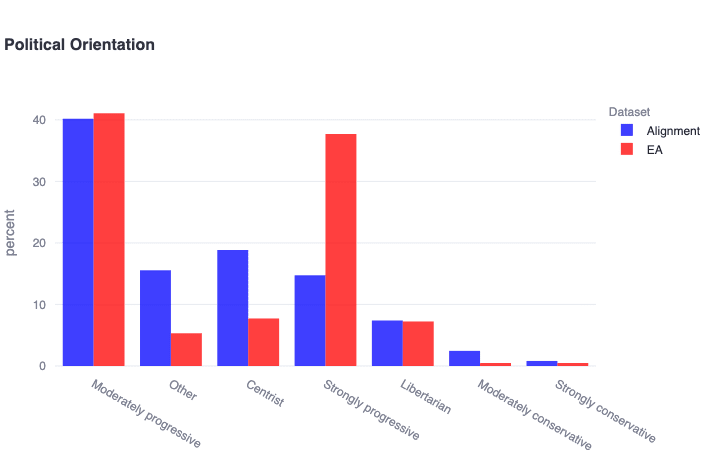 Result: Alignment researchers score significantly higher than the general population in neuroticism, openness, conscientiousness, extraversion (ordered here by the magnitude of the delta). Males outnumber females 9 to 1 in alignment. The community leans left politically and exhibits a diversity of other (albeit nonconservative) political views.