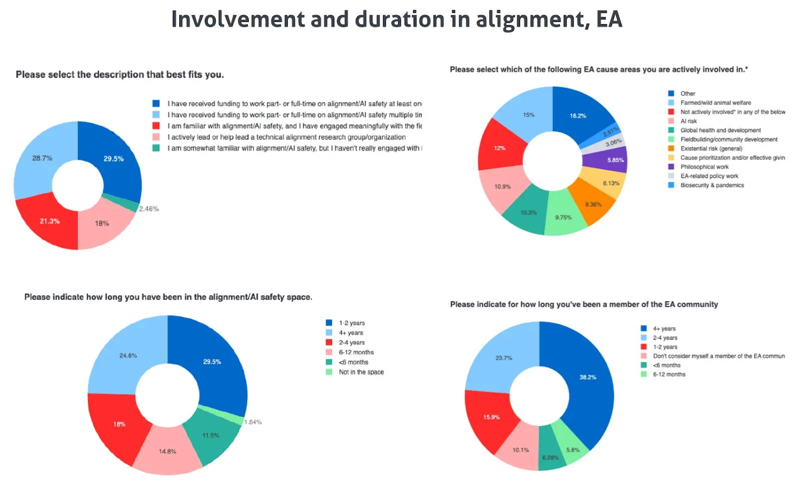 First, we asked for general demographic information, including the extent to which the respondent has engaged with the alignment research community, as well as the nature of the role they currently play.