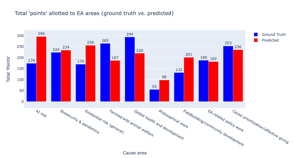 This result indicates that alignment researchers are most excited about evals and interpretability work, followed by various prosaic alignment approaches (eliminating deception, finetuning/model edits, goal robustness, etc.), are relatively less excited about 'make the AI solve it' approaches (the most prominent example being superalignment), and are even less excited about more theoretical approaches, including provably safe architectures, corrigibility, and the like. This result also clearly demonstrates that alignment researchers are well-calibrated in understanding that the community has this general prioritization.