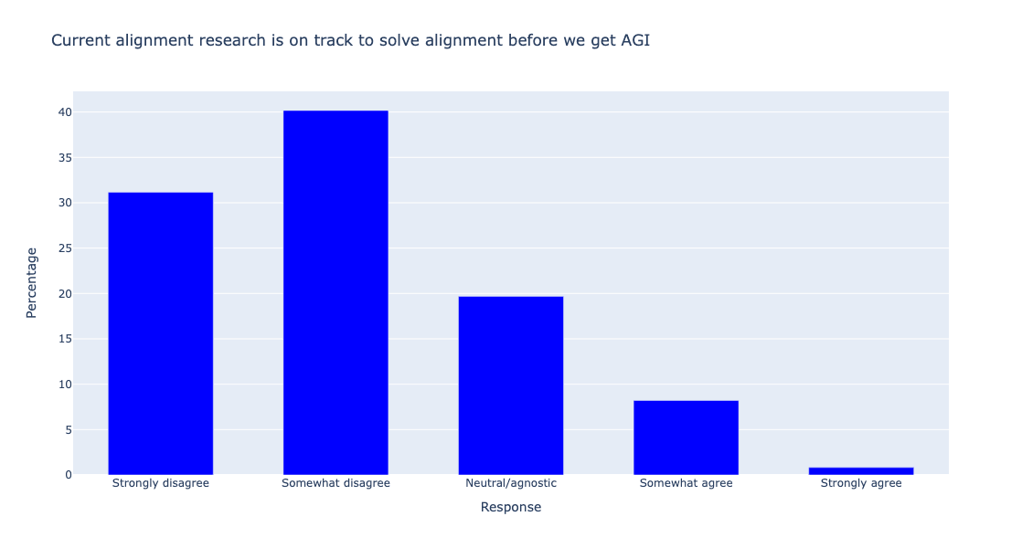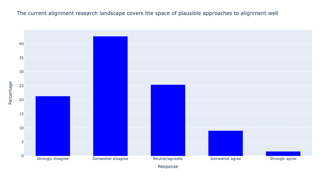 Result: Alignment researchers generally do not believe that current alignment research is on track to solve alignment and do not think that current research agendas exhibit strong coverage of the full space of plausible alignment approaches. However, alignment researchers did prove impressively accurate at predicting the research community's overall views on the relative promise of various technical alignment research directions (as systematized by Shallow review of live agendas in alignment & safety).