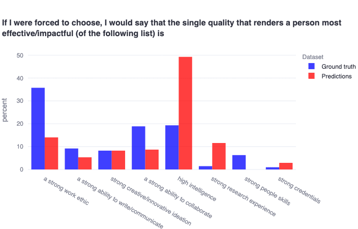 We find that respondents vastly overestimate (≈2.5x) how much high intelligence is actually valued, and underestimate other cognitive features like having strong work ethics, abilities to collaborate, and people skills. One potentially clear interpretation of this finding is that alignment researchers actually believe that high intelligence is necessary but not sufficient for being impactful—but perceive other alignment researchers as thinking high intelligence is basically sufficient. The community aligning on these questions seems of very high practical importance for hiring/grantmaking criteria and decision-making.