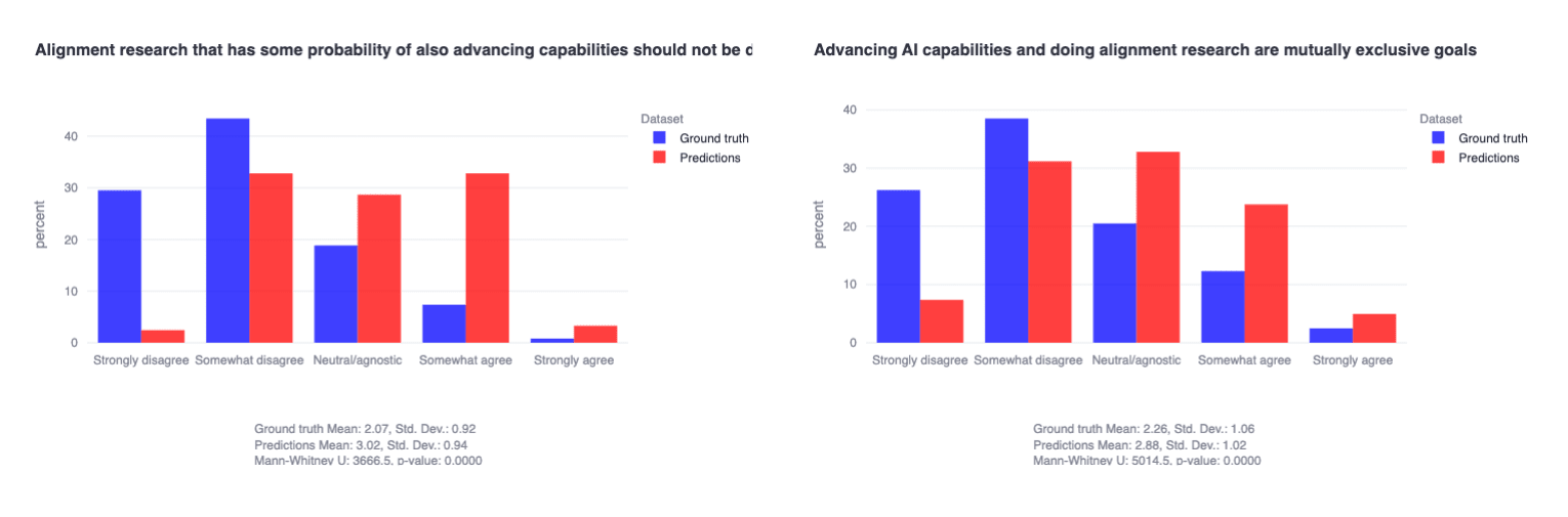 Result: Alignment researchers generally disagree with statements like 'alignment research that has some probability of advancing capabilities should not be done' and 'advancing AI capabilities and doing alignment research are mutually exclusive goals.' Interestingly, researchers also erroneously predicted that the community would generally view safety and capabilities work as incompatible.