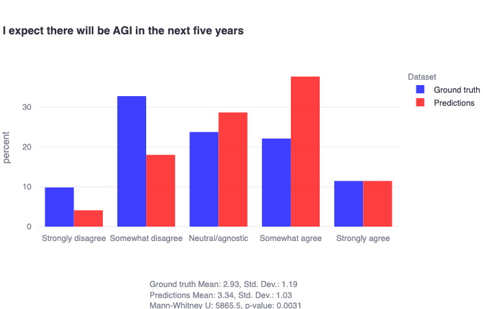 Another relevant misprediction of note relates to AGI timelines. Most alignment researchers do not actively expect there to be AGI in the next five years—but incorrectly predict that other alignment researchers do expect this in general. In other words, this distribution's skew was systematically mispredicted. Similar distributions can be seen for the related item, 'I expect there will be superintelligent AI in the next five years.'