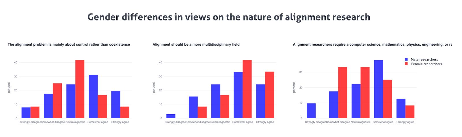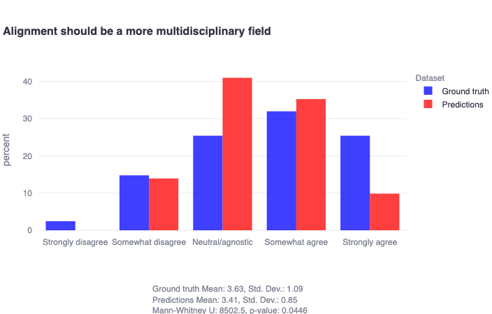 Finally, we share here that the majority of alignment researchers (>55%) agree to some extent that alignment should be a more multidisciplinary field, despite community expectations of a more lukewarm response to this question.