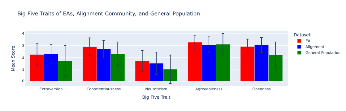 In general, the results of the Big Five assessment we administered indicate that alignment researchers tend to be fairly extraverted, moderately neurotic, intellectually open-minded, generally industrious, and generally quite compassionate. Compared to the general population, alignment researchers are significantly more extraverted, conscientious, neurotic, and open.
