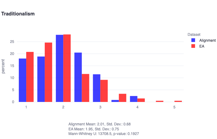 It is not very surprising that alignment researchers are low in traditionalism, which is typically associated with conservatism and more deontological/rule-based ethical systems. Worrying about issues like rogue AI might indeed be considered the epitome of 'untraditional' ethics. This result naturally pairs with the finding that there are virtually no conservative alignment researchers, which may have important implications for viewpoint diversity and neglected approaches in the community.