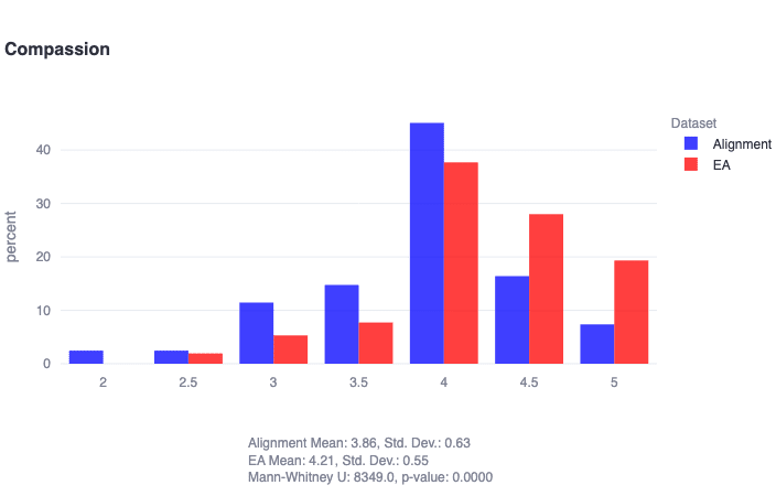 Alignment researchers clearly value compassion from a moral perspective. This result likely can be explained by the fundamental motivation to prevent AI-related catastrophes that could harm humanity.