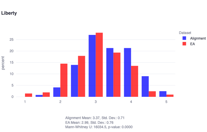 Implications: The generally-normally-distributed nature of the population on the moral foundation of liberty suggests that this value is either considered orthogonal to alignment philosophy (which seems less likely to us) or otherwise underexplored in relation to it (which seems more likely to us).