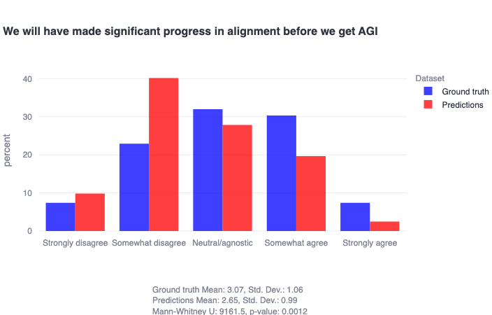 We asked the community to rate the extent to which they agreed with a number of specific claims in the general form, 'I think X' (e.g., I think alignment research is on track to solve alignment). Later on, we asked respondents to predict how their community in general would respond to these same questions in the general form, 'I think the alignment community as a whole believes X' (e.g., I think the alignment community as a whole believes that alignment research is on track to solve alignment). In this way, we position ourselves to be able to address two important questions simultaneously: