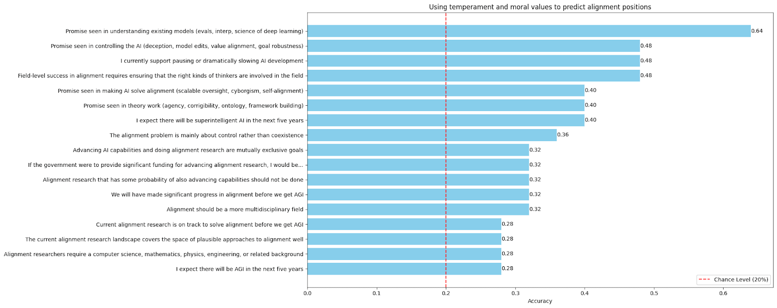 We show that respondents' trait-level scores from the psychometric instruments deployed can be used to predict alignment researchers' positions on the various alignment-specific questions significantly above chance level using a simple Random Forest Classifier (with balanced class weights). Feature importances reveal that many such predictions are based on seemingly sensible features—for instance, for the statement, "I currently support pausing or dramatically slowing AI development," the feature with the single highest importance is one's liberty moral foundation score, which makes a good deal of sense. For the "promise seen in controlling the AI (deception, model edits, value alignment, goal robustness)" question, the single feature with the highest importance is, quite intriguingly, one's own self-control score on the Brief Self-Control Scale.