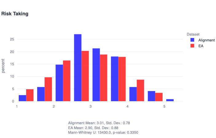 It is also somewhat unsurprising that two key differentiators between the alignment community and the general population appear to be (1) significantly higher sensitivity to negative emotion and (2) significantly higher openness. It seems clear that individuals attracted to alignment are particularly calibrated towards avoidance of negative long-term outcomes, which seems to be reflected not only in the community's higher neuroticism scores, but also in our measurements of fairly tepid attitudes towards risk-taking in general. Additionally, higher openness should certainly be expected in communities organized around ideas, rationality, and intellectual exchange. However, it also seems likely that alignment researchers may score significantly higher in intellect (often described as 'truth-oriented')—one of the two aspects/constituent factors of trait openness—than openness to experience (often described as 'beauty-oriented'). Pinning down this asymmetry more precisely seems like one interesting direction for follow-up work.