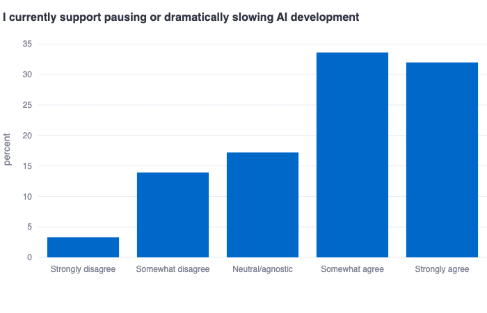 It is very clear that alignment researchers generally support pausing or dramatically slowing AI development (>60% agreement), which naturally pairs with the finding that alignment researchers do not think we are currently on track to solve alignment before we get AGI.