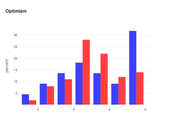 In blue are respondents who actively lead alignment orgs, and in red are all other alignment researchers. We probed trait optimism (ie, not optimism about alignment specifically) in the survey using items like "I see myself as someone who is an optimist," "...who has a 'glass-half-full' mentality," etc. and found an interesting pocket of extremely optimistic alignment org leaders! This finding suggests an important (if somewhat obvious) motivating factor of good leaders: genuinely believing that effortfully pushing forward impactful work is likely to yield very positive outcomes.