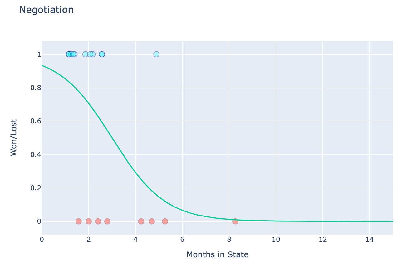 Initially, when negotiations begin, our odds likely exceed 90%. But the longer the negotiation lingers, the less likely we are to close. Intuitively, we all grasp this idea, and yet existing software often ignores it altogether. Why? Perhaps sigmoid functions cause great consternation and flashbacks to university coursework. More likely, we’d prefer to ignore the unpleasant reality that, with each passing day, we find ourselves slip slidin’ away from our sale.